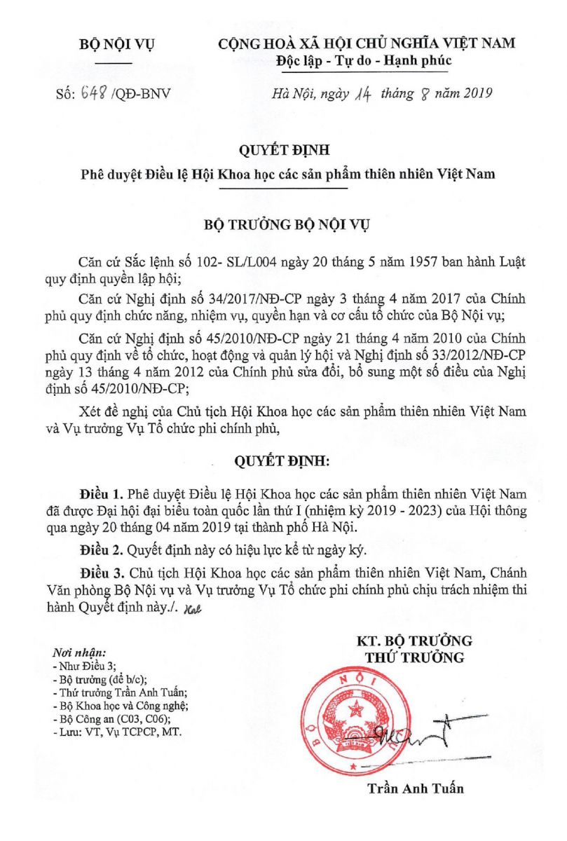 Ngày 14/8/2019, Bộ Nội vụ đã Ban hành Quyết định số 648/QĐ-BNV về việc phê duyệt Điều lệ Hội khoa học các sản phẩm thiên nhiên Việt Nam đã được Đại hội đại biểu toàn quốc lần thứ I (nhiệm kỳ 2019 - 2023) của Hội thông qua ngày 20/4/2019 tại Thành phố Hà Nội.